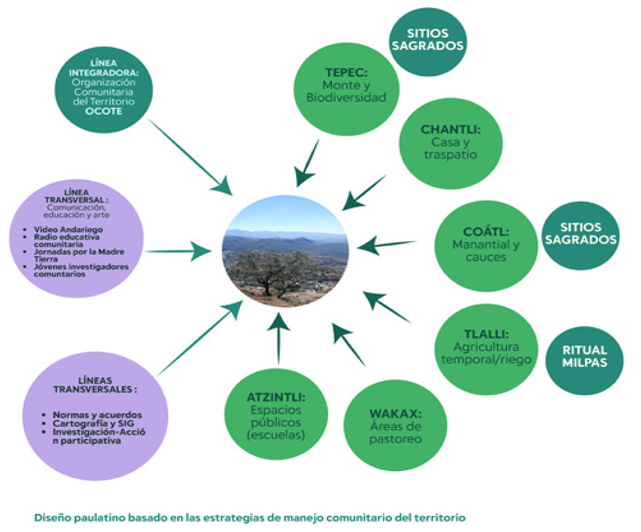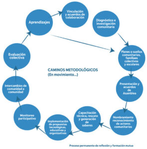 Fueron años de mucha creatividad para seguir generando métodos de trabajo que nos permitieron ir ampliando los espacios de participación comunitaria y a la vez, sobre la marcha, a partir de la praxis y de los procesos colectivos de análisis y reflexión, ir transformando los conceptos, tanto los propios como los ajenos. Por ejemplo, después de ver de cerca otros métodos y prácticas de “ordenamiento territorial” no decididos plenamente desde el corazón y los saberes campesinos, preferimos avanzar hacia la organización comunitaria del territorio, con el agua, el maíz, las semillas y la comida en su centro, en manos de las comunidades y sus instituciones.
